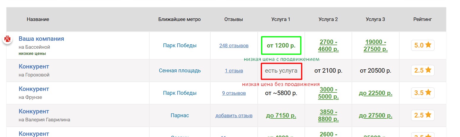Вокруг продвигаемой таким образом клиники выбирается некоторое количество ближайших конкурирующих клиник, продвигаемая клиника попадёт к ним в таблицу «Сравнение по ценам», которая выглядит следующим образом: